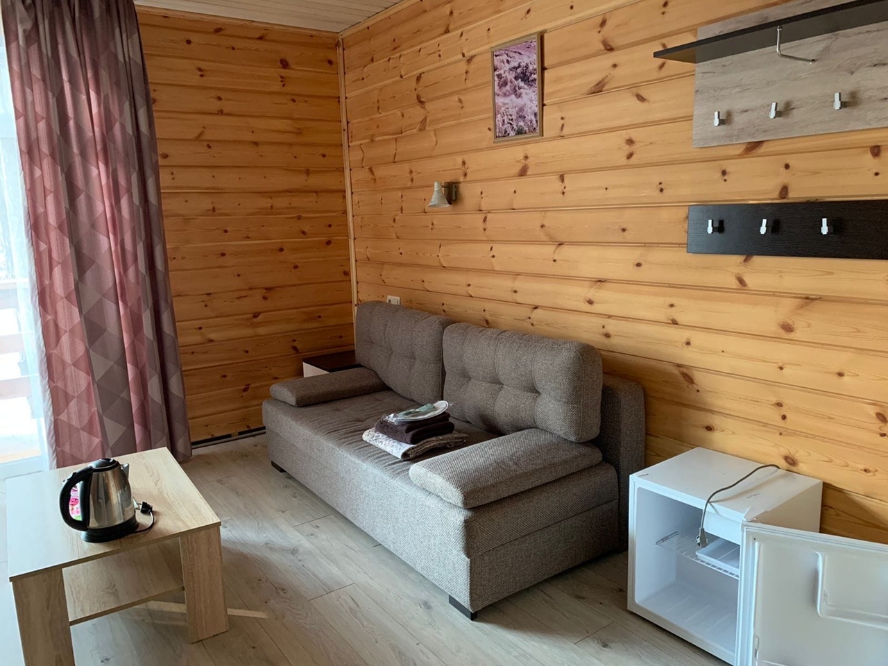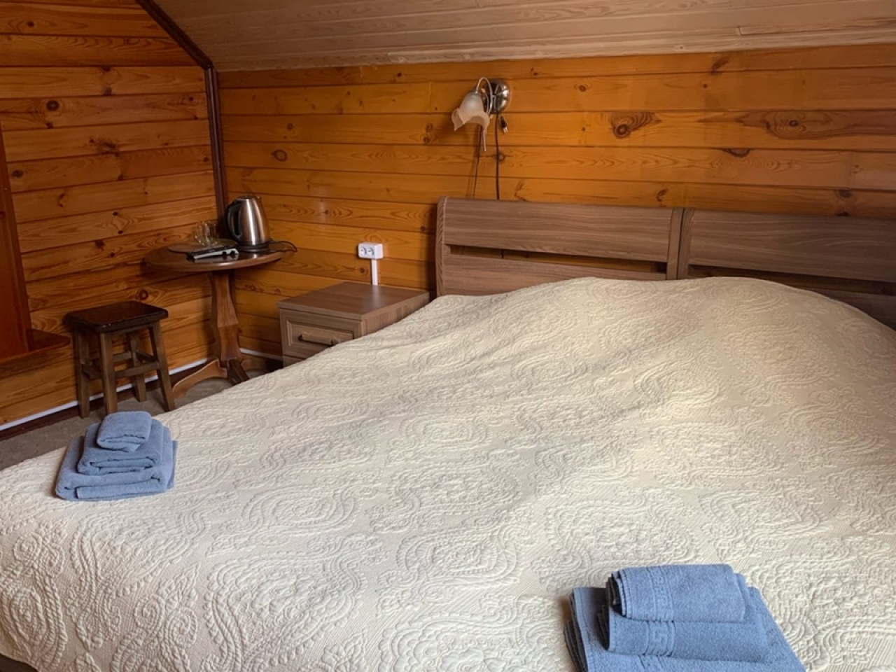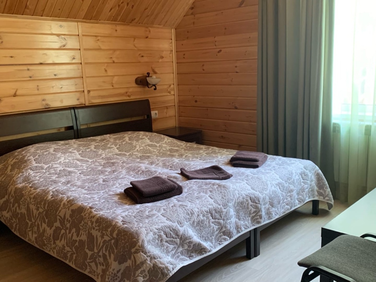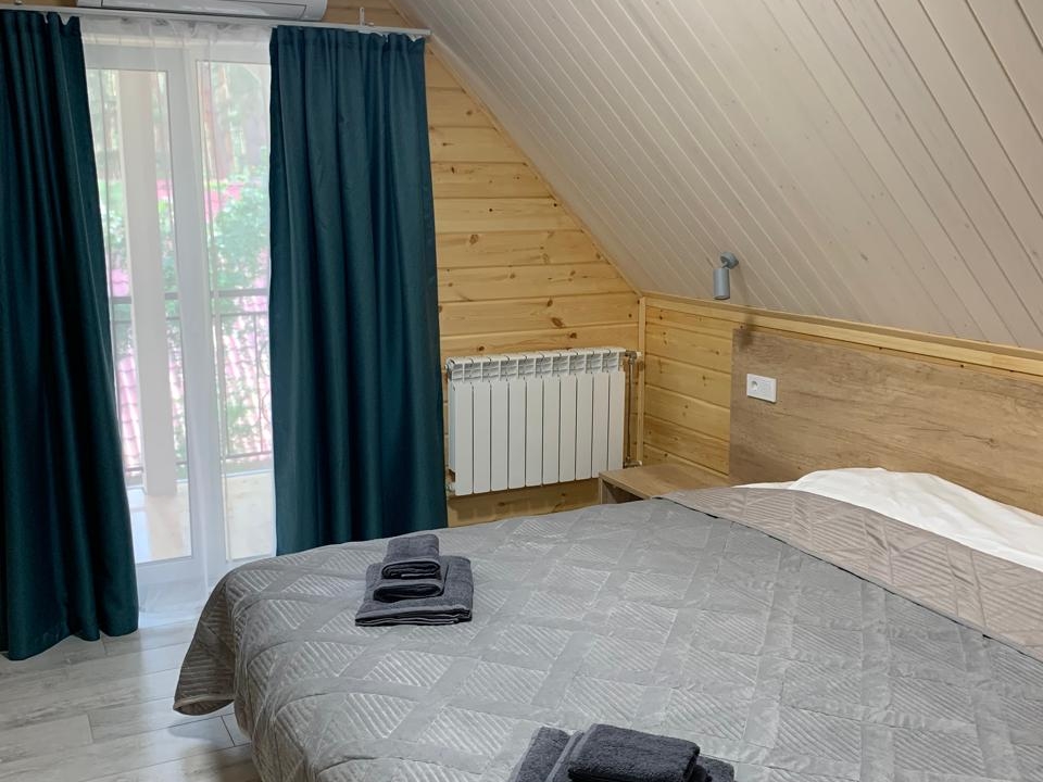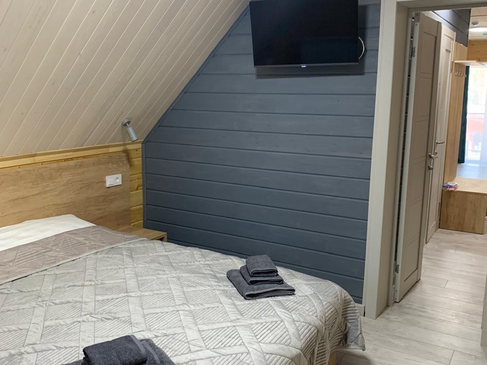 Полулюкс с отделкой под дерево, большие "в пол" окна. Имеет балкон или веранду с видом на Катунь или территорию отеля и санузел с душевой кабиной. Укомплектован: двухспальная или две односпальные кровати, две тумбочки, диван, стол, два стула, прихожая, шифоньер, чайник, холодильник, телевизор, С/У, фен, халаты. туалетные принадлежности.