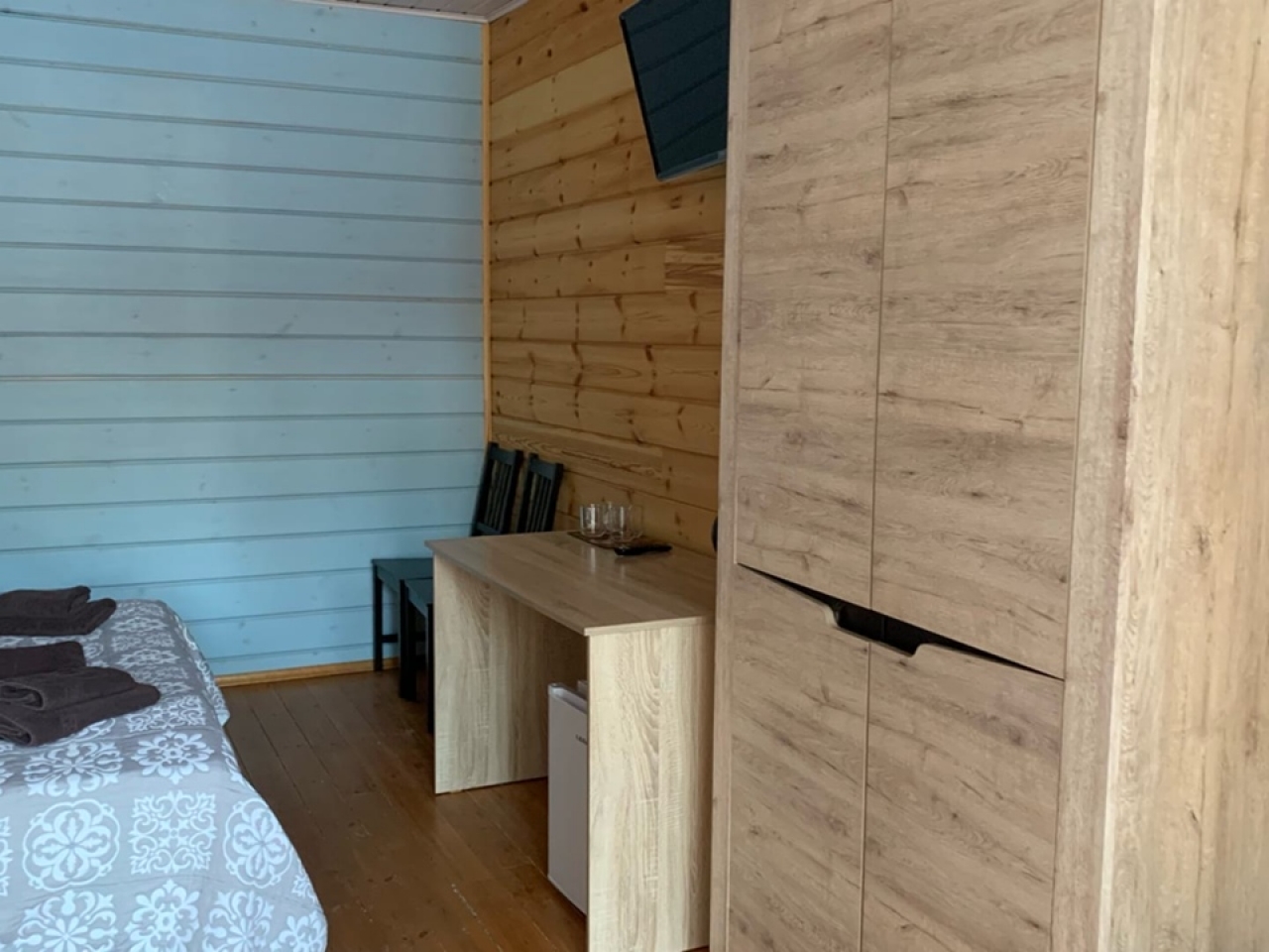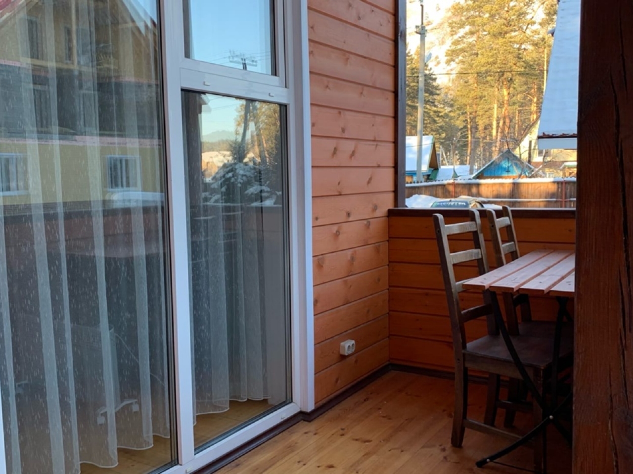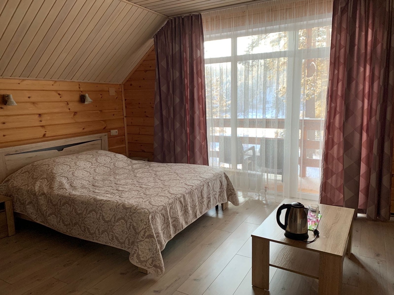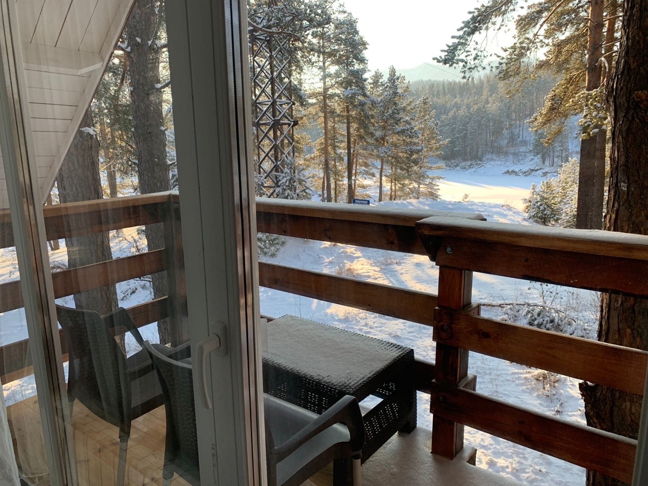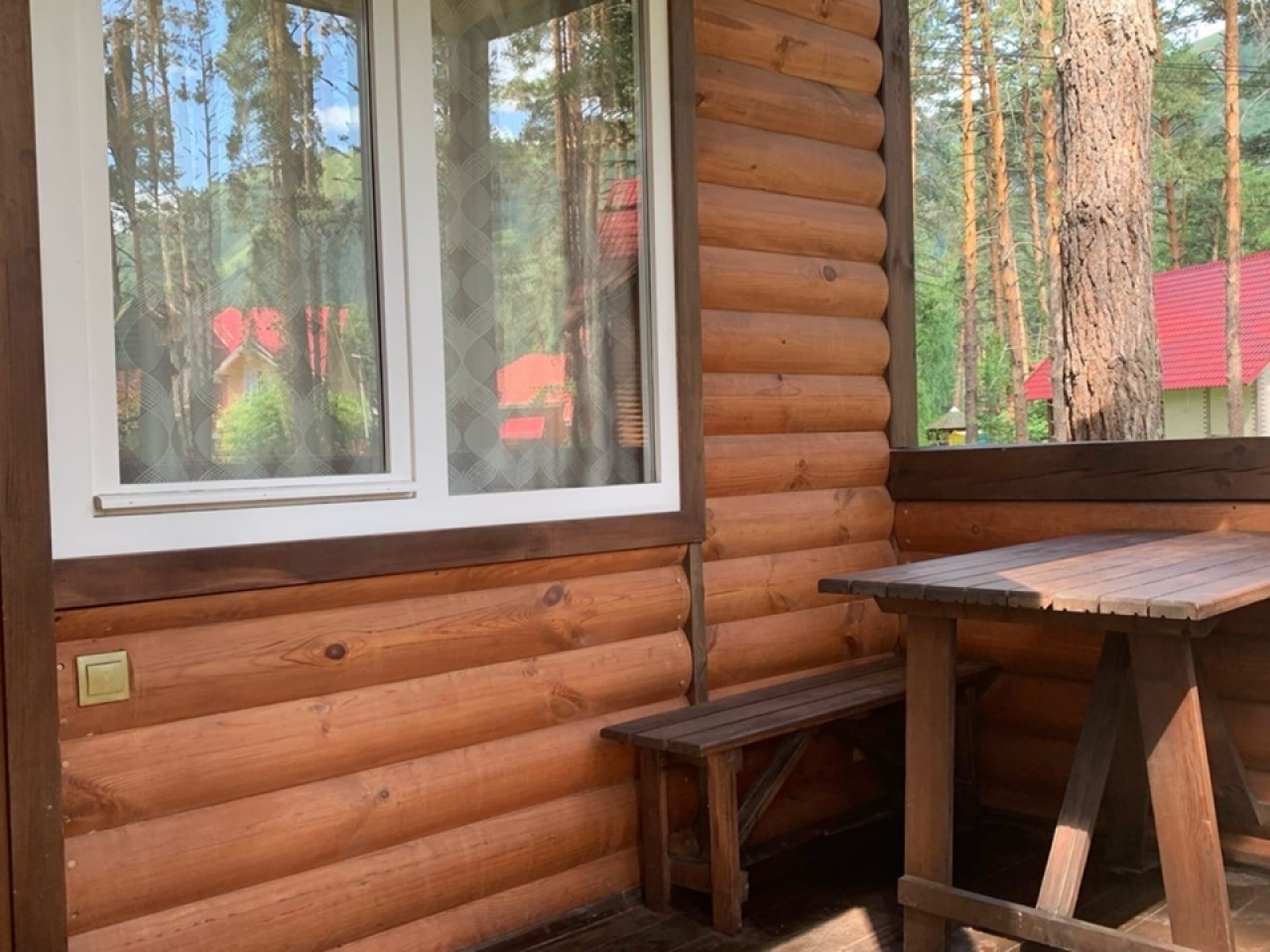 Номер категории «Полулюкс с балконом / террасой» — Полулюкс с отделкой под дерево, большие "в пол" окна. Имеет балкон или веранду с видом на Катунь или территорию отеля и санузел с душевой кабиной. Укомплектован: двухспальная или две односпальные кровати, две тумбочки, диван, стол, два стула, прихожая, шифоньер, чайник, холодильник, телевизор, С/У, фен, халаты. туалетные принадлежности.