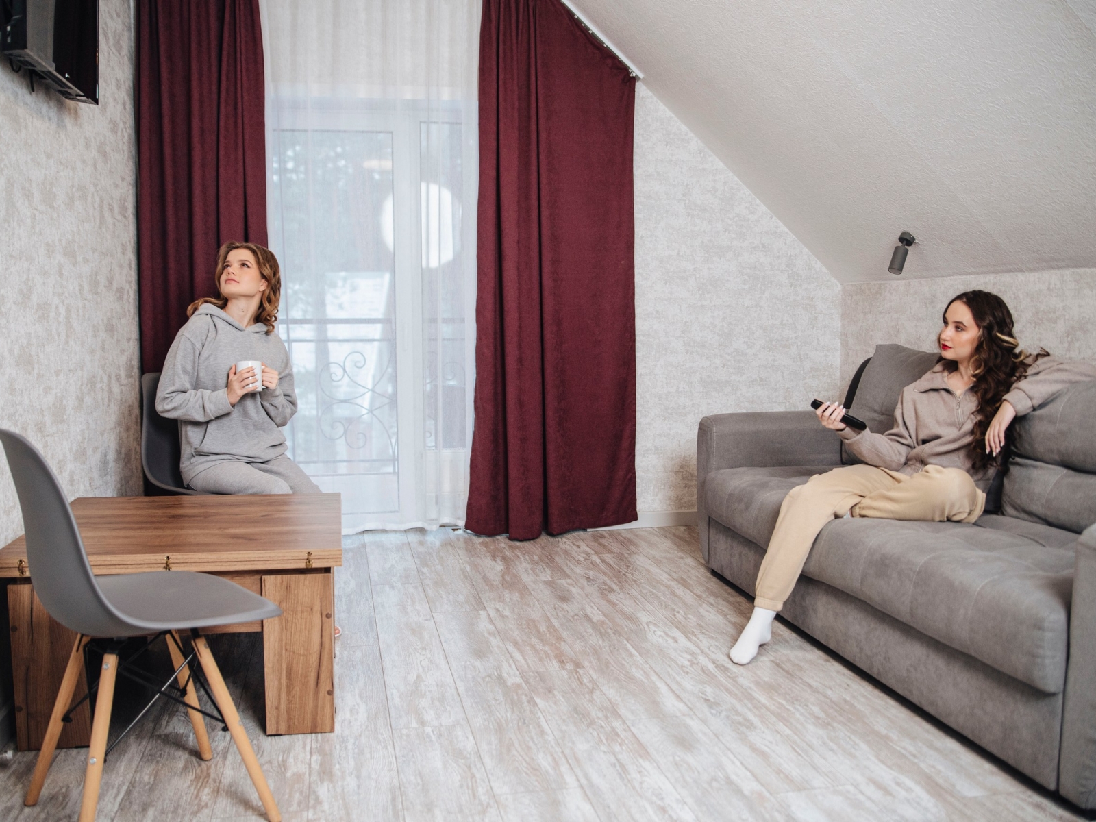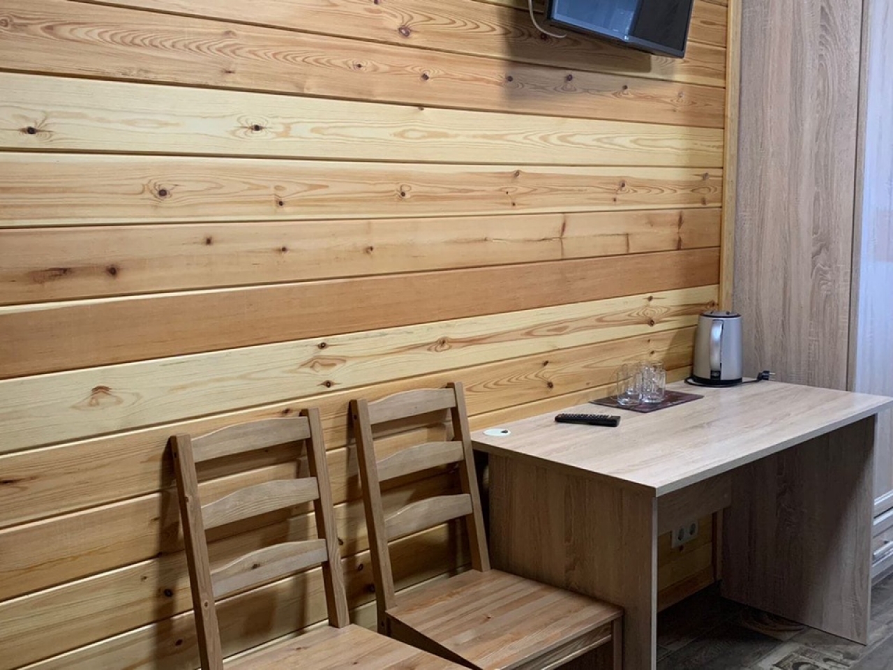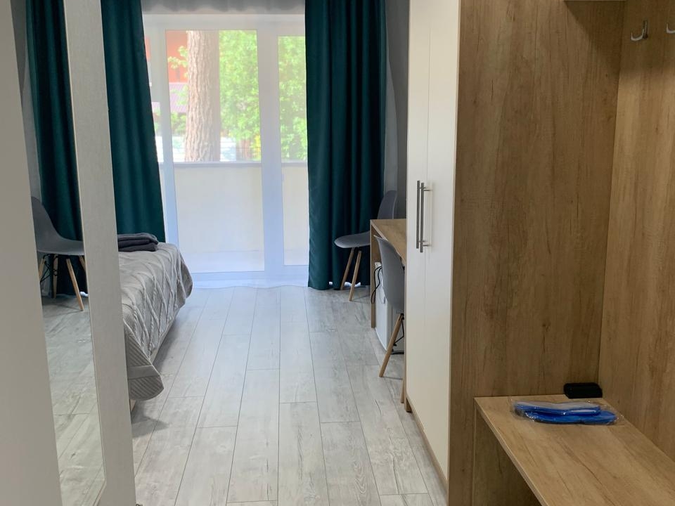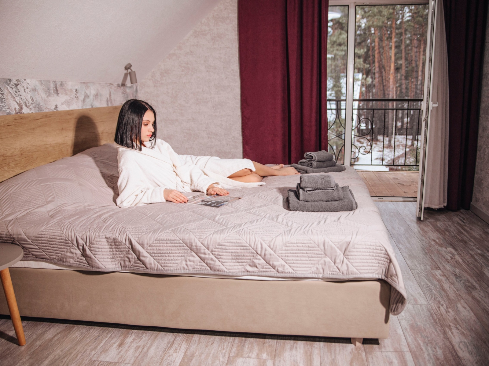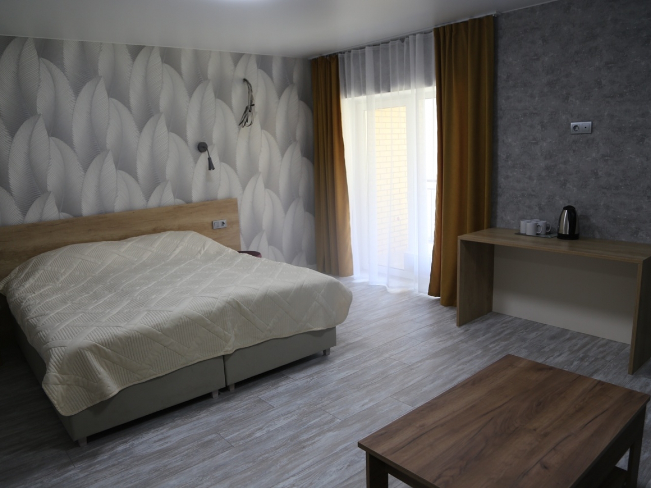 Номер категории «Полулюкс с балконом / террасой» — Полулюкс с отделкой под дерево, большие "в пол" окна. Имеет балкон или веранду с видом на Катунь или территорию отеля и санузел с душевой кабиной. Укомплектован: двухспальная или две односпальные кровати, две тумбочки, диван, стол, два стула, прихожая, шифоньер, чайник, холодильник, телевизор, С/У, фен, халаты. туалетные принадлежности.